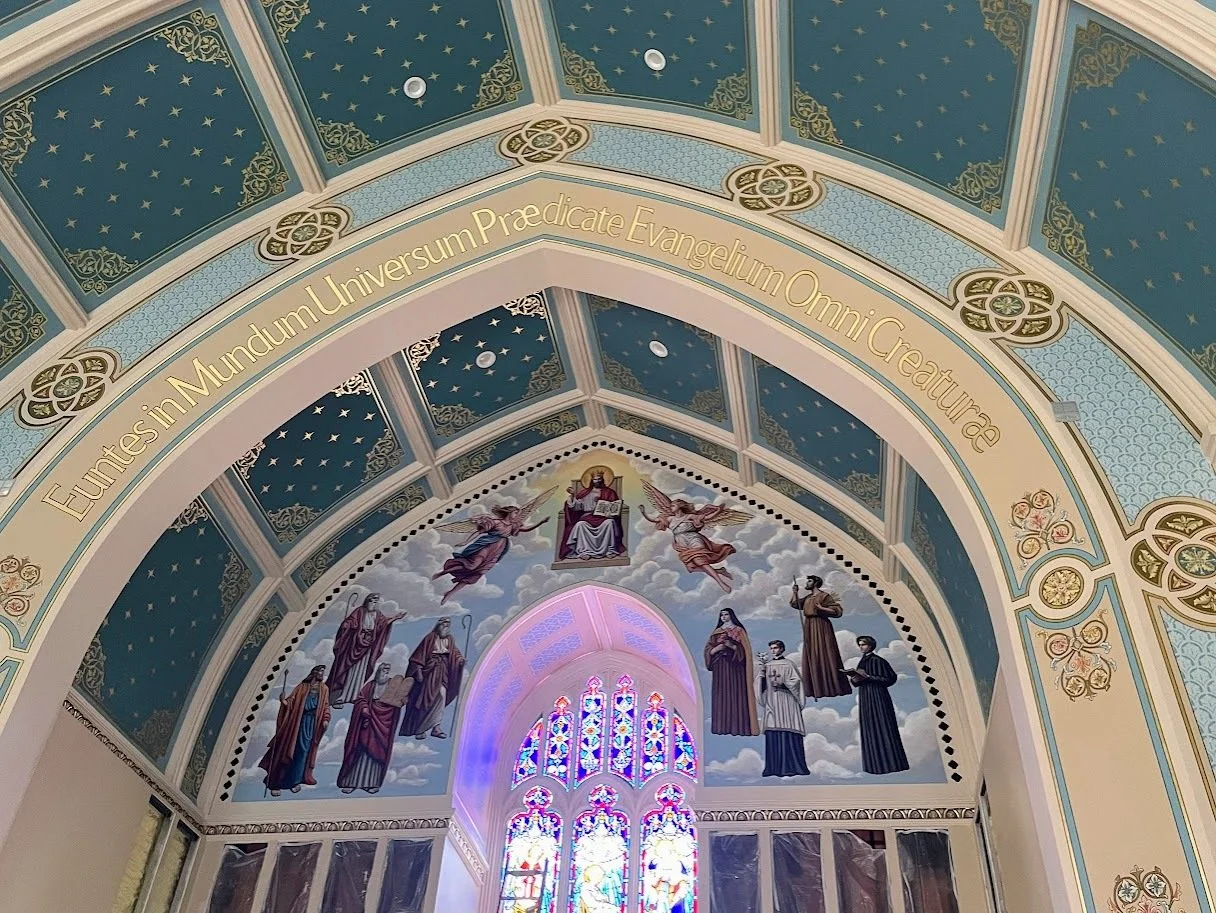 Later in the year and just days before Christmas, the first phase of large murals was be installed – roundels featuring a coronation of the Blessed Virgin Mary as Star of the Sea on the front wall above the altar and an image of Christ the Divine Physician on the rear wall above the entry doors – with subsequent decorative paint and murals yet to come in 2025.