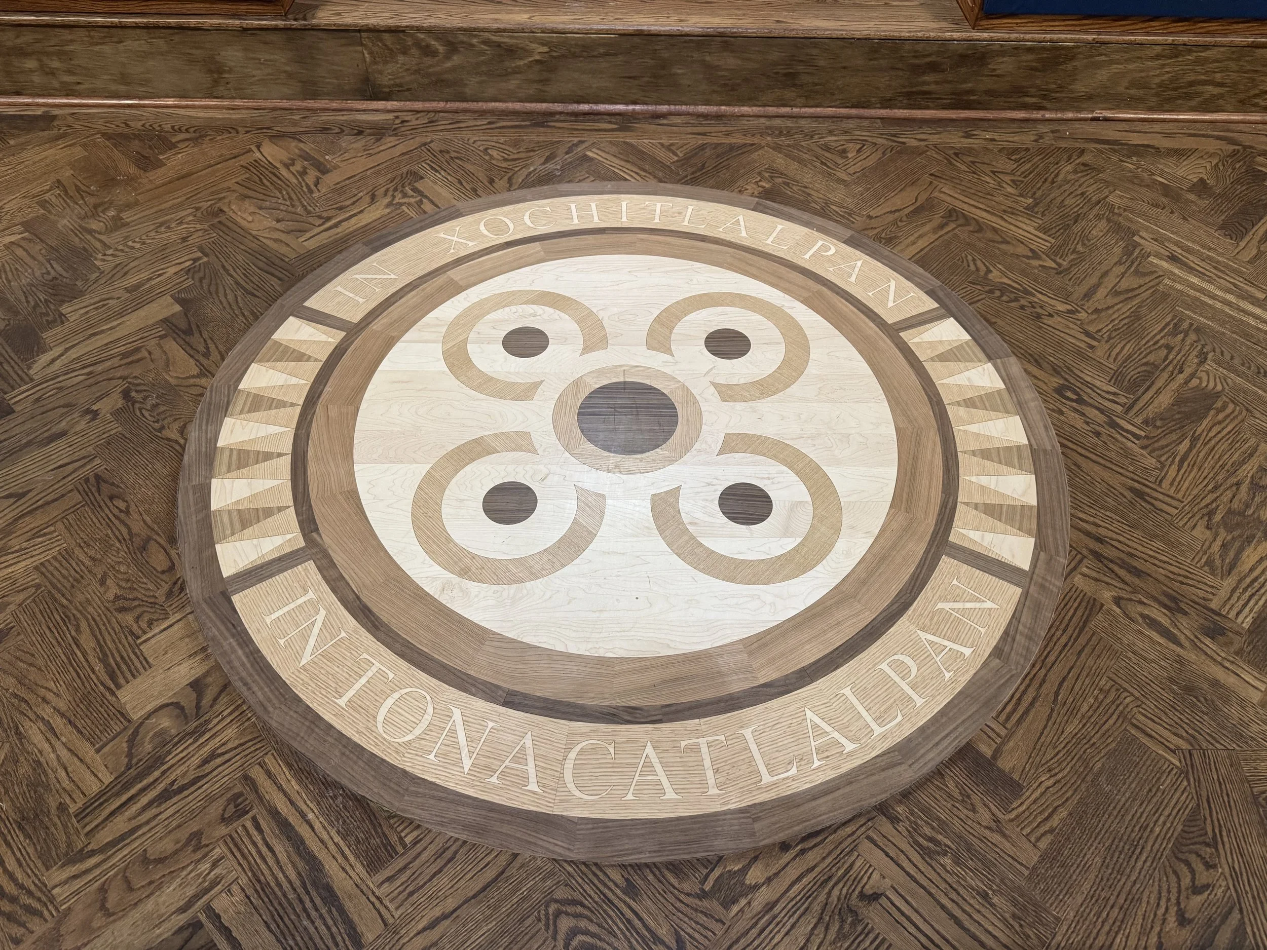 Blessed Sacrament Catholic Church in Kansas City, KS installed intricate new wooden flooring medallions based on the theme of Guadalupe and the Flower World Prophecy.