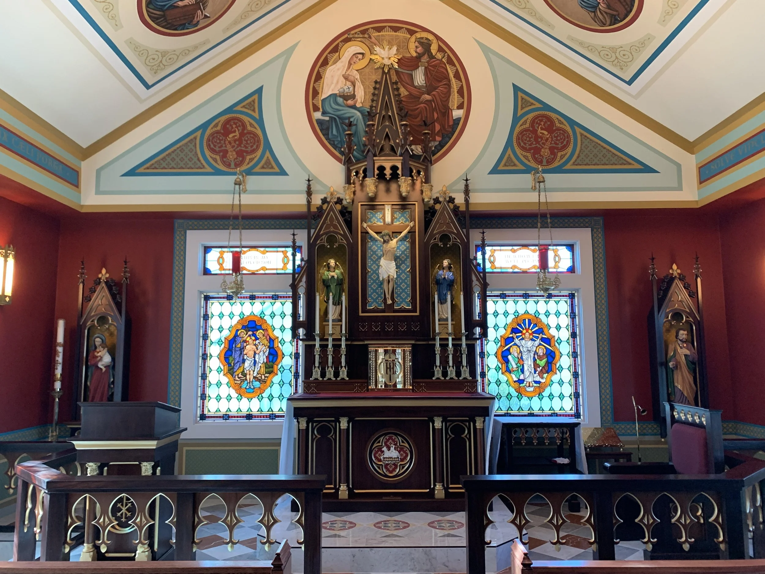 Gothic furnishings by Little Way Construction, Stained Glass by Foster, Crucifix / Statuary by ALBL Oberammergau, and decorative paint by New Jerusalem Studios & Stabat Mater Foundation all adorn the chapel.